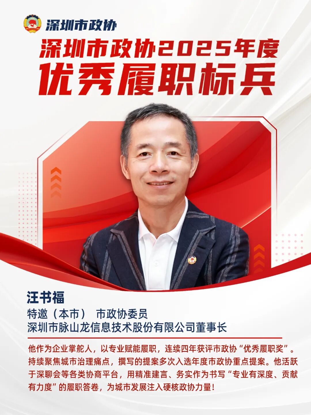 汪书福,特邀(本市),市政协委员,深圳市脉山龙信息技术股份有限公司董事长。